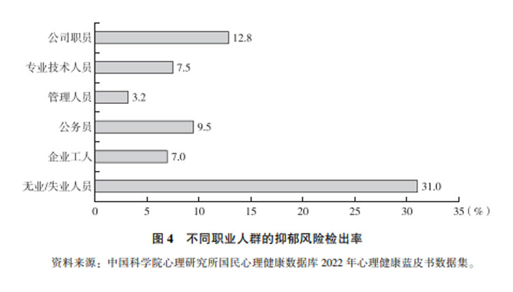 調(diào)查發(fā)現(xiàn):無工作崗位/失業(yè)/待業(yè)人群的抑郁風險檢出率最高,當前雖有工作崗位但基本沒進行工作的群體,抑郁風險檢出率次高,與無工作崗位/失業(yè)/待業(yè)人群非常接近。