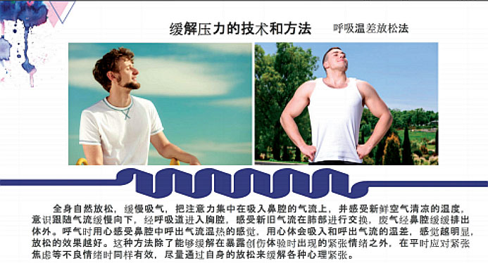 感受呼吸溫差放松法是腹式呼吸方法的一個變種與腹式呼吸的區(qū)別在于加入了意念。全身自然放松,緩慢吸氣,把注意力集中在吸入鼻腔的氣流上,并感受新鮮空氣清涼的溫度,意念跟隨氣流緩慢向下,經(jīng)呼吸道進(jìn)入胸腔,感受新舊氣流在肺部進(jìn)行交換,廢氣經(jīng)鼻腔緩緩排出體外。呼氣時用心感受鼻腔中呼出氣流溫?zé)岬母杏X,用心體會吸入和呼出氣流的溫差,感覺越明顯放松的效果越好。