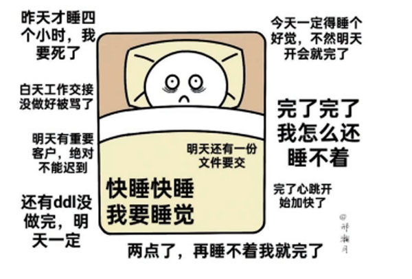 “今天我說的那句話實在是不合適……她那么說是不是不喜歡我?明天我的演講不會出什么岔子吧……”“只能睡三個小時了,我要快點入睡,再不睡覺明天一定沒精神了!”當(dāng)小高準備入睡的時候,令他擔(dān)憂的事情、睡不著覺的惡果,總是一件一件蹦到腦海之中,讓他不能安穩(wěn)地睡一個覺。小高對此總是很苦惱,他不喜歡這種只發(fā)生在睡前的“一日三省吾身”。隨著這些想法被喚起的焦慮和恐慌,會十分打擾小高的睡眠。