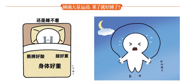 到了小高該睡覺的時間,他專心致志地躺在了床上,等待著入睡。但很快,小高就感受到了一些不對勁:他的心率似乎并沒有減慢太多,依舊在他的胸膛里“砰砰砰”地跳著,自己的情緒似乎也并不是即將入睡前的平靜,還保留著一些運動時的躁動?!斑@是怎么回事?難道睡前運動還有礙于睡眠嗎?”小高百思不得其解。