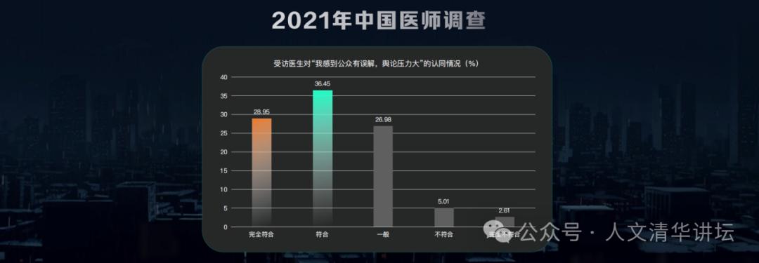 我們在2021年做了另一個關于中國醫(yī)師的社會調查。這個調查在中國醫(yī)師協(xié)會人文醫(yī)學專業(yè)委員會的支持和幫助下實施,我們在全國28個省市回收了12000多份有效問卷,并且訪談了40多位醫(yī)生。結果顯示,公眾對醫(yī)生有兩個極端的評價,一種評價認為醫(yī)生是非常高尚的職業(yè),是救死扶傷的白衣天使;另一種評價認為醫(yī)生是令人厭惡的職業(yè),這種評價主要出現(xiàn)于醫(yī)患沖突的案例之中。事實上,醫(yī)生們有不一樣的感受。數(shù)據(jù)顯示,大約有75%的醫(yī)生認為公眾對他們的評價有誤解,而這樣的誤解也有一些客觀基礎。對醫(yī)生的出診過程的調查結果顯示,每個醫(yī)生在出診日會有平均超過8個小時的診療任務,這是一個很長的時間段。因為醫(yī)生在出診前要做很多準備,出診后還要整理自己的出診記錄、材料等。在這么長的出診時間里,我們可以想得到,醫(yī)生的工作強度可能會進一步提升,有超過15%的大夫在出診日接診的患者會超過50個人。