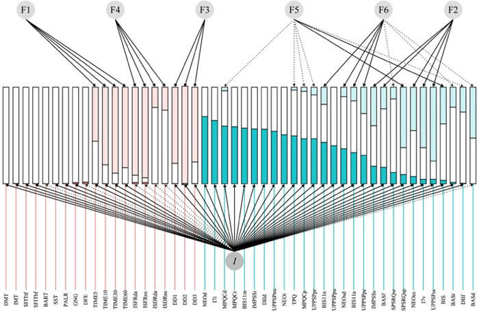 沖動性的雙因子模型。藍(lán)色為自我報告量表指標(biāo),紅色為行為測量指標(biāo)。I代表提取的一般沖動性因子,F(xiàn)1至F6為特殊因子。每個指標(biāo)條上部的淺色部分代表可由特殊因子解釋的變異;下部的深色部分代表可由一般因子I解釋的變異;中間的白色部分代表無法被解釋的變異。虛線箭頭表示負(fù)載荷,實(shí)線箭頭表示正載荷