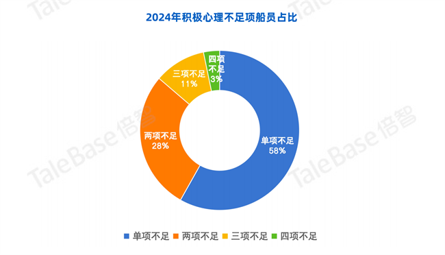有多項(xiàng)消極心理因素同時(shí)為高風(fēng)險(xiǎn)的船員較少,6項(xiàng)消極心理因素均為“高風(fēng)險(xiǎn)”的船員占比低于1%,但同時(shí)有多項(xiàng)積極心理因素不足的船員約為40%,說(shuō)明船員整體較少存在比較極端的消極心理風(fēng)險(xiǎn),但他們?cè)诜e極心理因素的提升上有較大的發(fā)展空間,通過(guò)針對(duì)性的積極心理因素提升,補(bǔ)充心理動(dòng)能,讓他們有更多的積極心理去調(diào)節(jié)和消化消極心理,進(jìn)一步減少由于極端消極心理狀態(tài)可能導(dǎo)致的不良事件的風(fēng)險(xiǎn)。