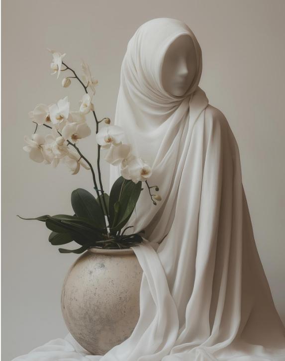 畫面中人類形象以模糊的輪廓象征復(fù)雜情感,凝望遠(yuǎn)方,寓意在創(chuàng)痛中尋找重生力量。懷中的花盆隱喻人工智能在情感裂痕中的介入,反映科技如何在親子斷裂中創(chuàng)造新連結(jié),揭示孤獨(dú)與治愈的心理掙扎。