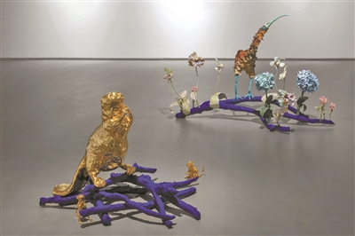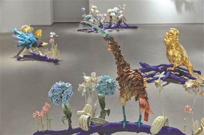 走進(jìn)展廳,眼睛即刻被明快的色彩征服?!痘脡?mèng)花園》系列的花卉雕塑分布在展廳的墻面與地面,在純白的空間里,那些樹脂、軟陶、丙烯顏料制成的枝葉和花卉絢麗多彩,樹枝上停著好奇的鳥類,穿過(guò)樹葉看向遠(yuǎn)方。但仔細(xì)想想,在現(xiàn)實(shí)生活中,豬籠草、鳶尾、蝴蝶蘭和蘑菇并不屬于那些枝干,這樣的組合略顯詭異。尤其是進(jìn)入展廳看到的第一個(gè)作品《狼與月》,一頭大灰狼把一只帶有四肢的雞蛋扛在肩頭,作者想要表達(dá)的內(nèi)容此刻像一團(tuán)迷霧,散布在展廳中。