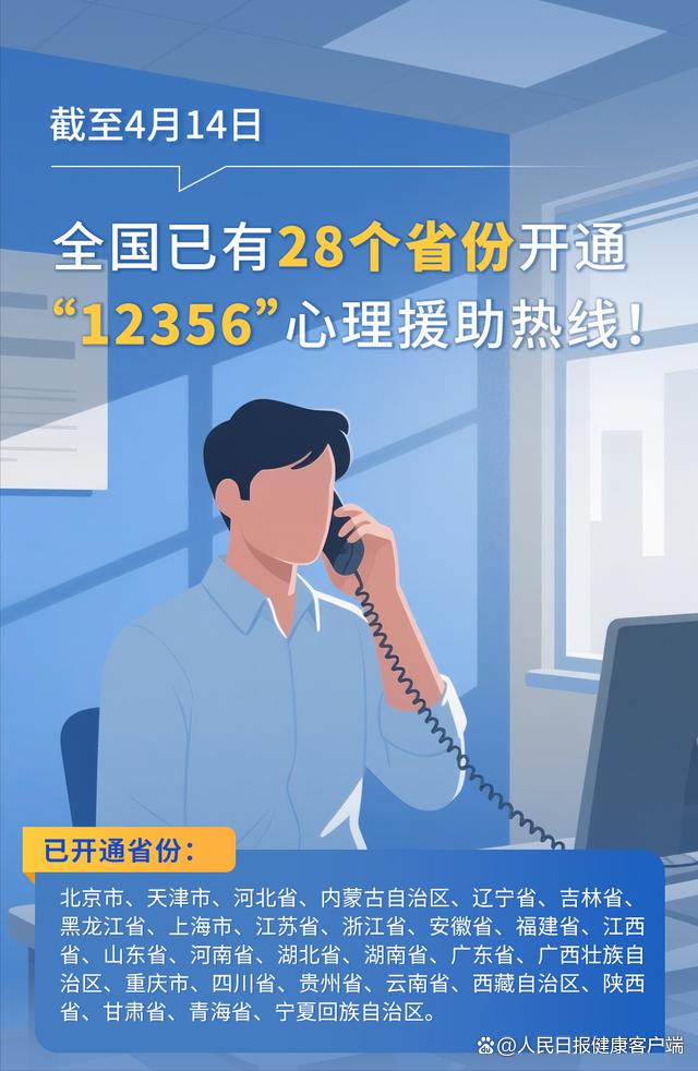 據(jù)人民日報健康客戶端記者不完全統(tǒng)計,截至4月14日,全國已有28個省市開通“12356”心理援助熱線:北京市、天津市、河北省、內(nèi)蒙古自治區(qū)、遼寧省、吉林省、黑龍江省、上海市、江蘇省、浙江省、安徽省、福建省、江西省、山東省、河南省、湖北省、湖南省、廣東省、廣西壯族自治區(qū)、重慶市、四川省、貴州省、云南省、西藏自治區(qū)、陜西省、甘肅省、青海省、寧夏回族自治區(qū)。