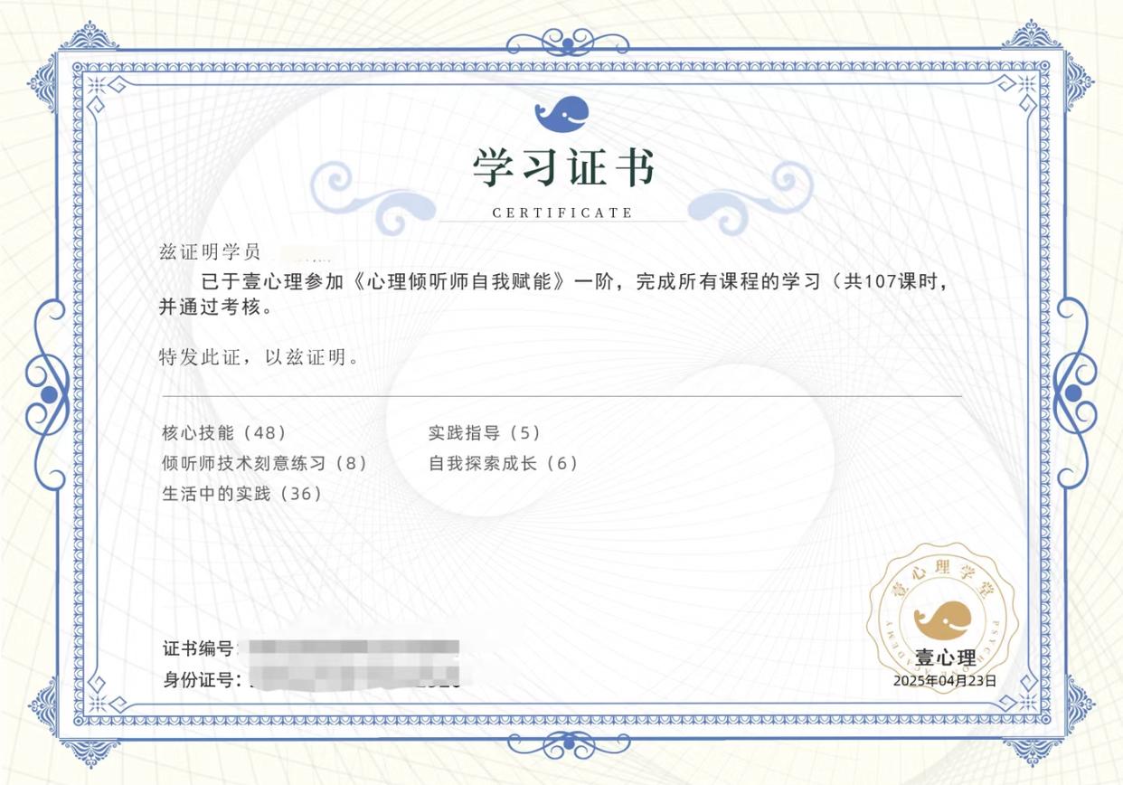 “壹心理”平臺招生人員向記者展示的該機(jī)構(gòu)培訓(xùn)學(xué)習(xí)證書。受訪者供圖