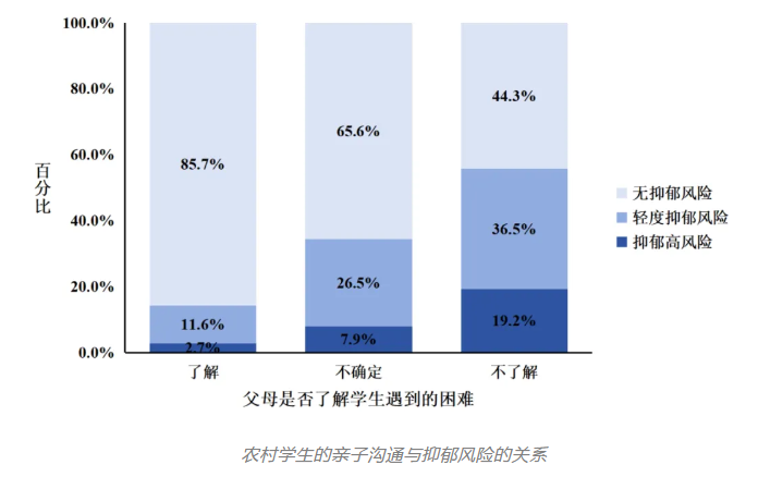 親子溝通是父母提供有效支持的重要基礎(chǔ)。報(bào)告指出,當(dāng)學(xué)生認(rèn)為父母不了解自己遇到的困難時(shí),抑郁風(fēng)險(xiǎn)較高,其抑郁高風(fēng)險(xiǎn)檢出率為認(rèn)為父母了解自己遇到的困難的學(xué)生這一組的7倍。