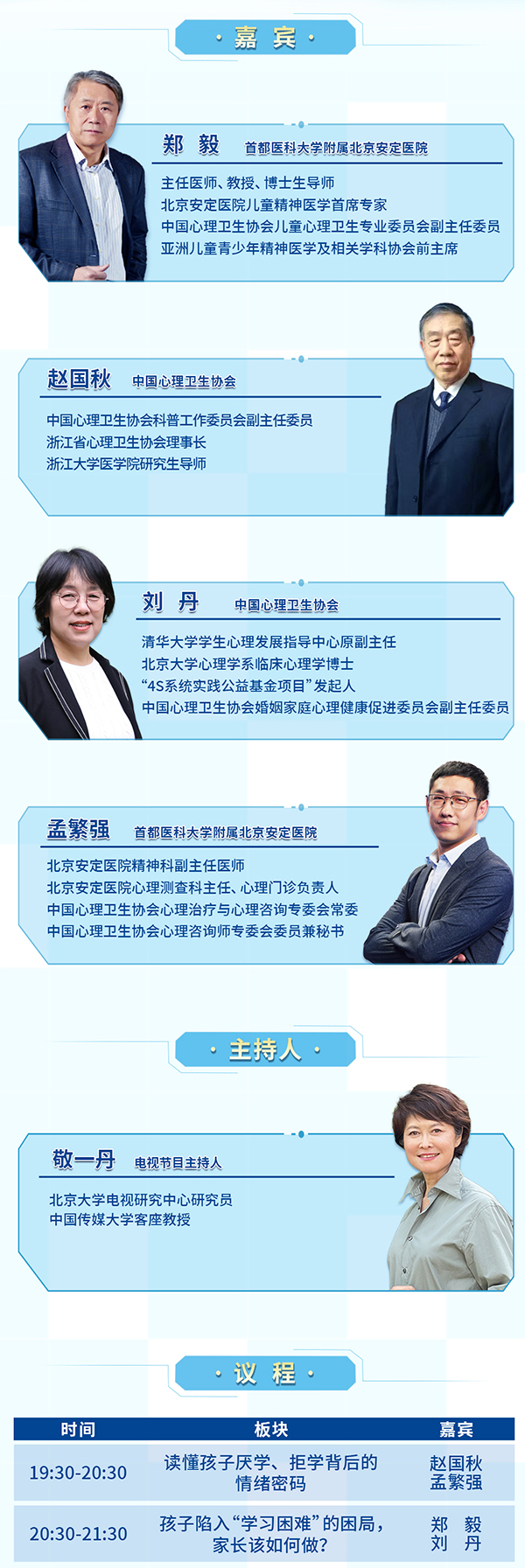 直播節(jié)目中,主持人敬一丹將攜手四位國(guó)內(nèi)專家:首都醫(yī)科大學(xué)附屬北京安定醫(yī)院兒童精神醫(yī)學(xué)首席專家鄭毅、中國(guó)心理衛(wèi)生協(xié)會(huì)科普工作委員會(huì)副主任趙國(guó)秋、北京大學(xué)心理學(xué)系臨床心理學(xué)博士劉丹、北京安定醫(yī)院心理門診負(fù)責(zé)人孟繁強(qiáng),進(jìn)行兩小時(shí)的深度訪談。專家們將通過多個(gè)案例破解困住千萬家庭的養(yǎng)育困境。