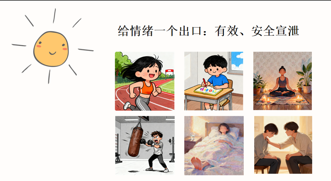“情緒不是敵人,而是成長(zhǎng)的動(dòng)力?!眳轻t(yī)生進(jìn)一步講解了情緒的正面意義:焦慮提醒我們努力,委屈呼喚理解,疲憊信號(hào)提示休息……他鼓勵(lì)同學(xué)們正視情緒,學(xué)會(huì)與情緒共處,正視而非敵視情緒。