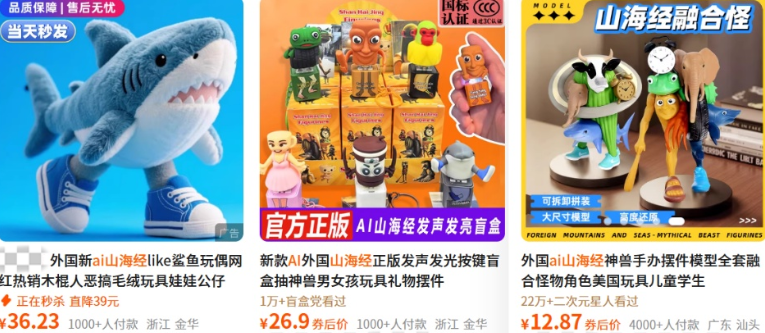 在國內(nèi),此類“外國山海經(jīng)”形象不僅在短視頻平臺傳播。記者注意到,電商平臺已經(jīng)有大量此類玩具,比如駱駝軀干被替換為冰箱的玩偶,還有象頭、蛙臉、輪胎身、人腳的拼接玩偶等等。