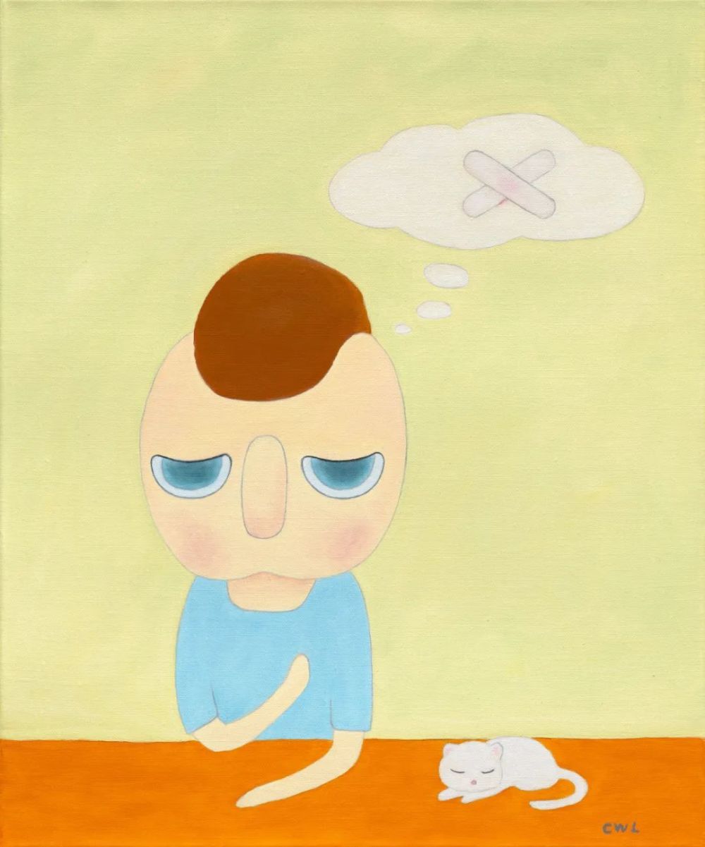 展覽的第四部分《我的傷心云知道》既是展覽的一個篇章,也是整個展覽的主題。畫中的人物形象手扶胸口,聊以慰藉的是創(chuàng)可貼的擁抱與身旁小貓的陪伴,至此化身成為困境中嘗試自我療愈并達成身體與精神相互慰藉的個體。