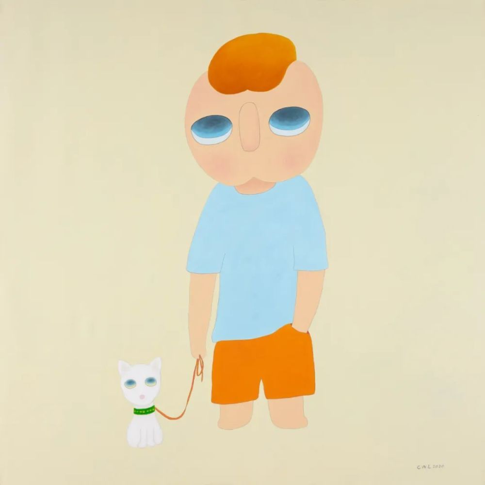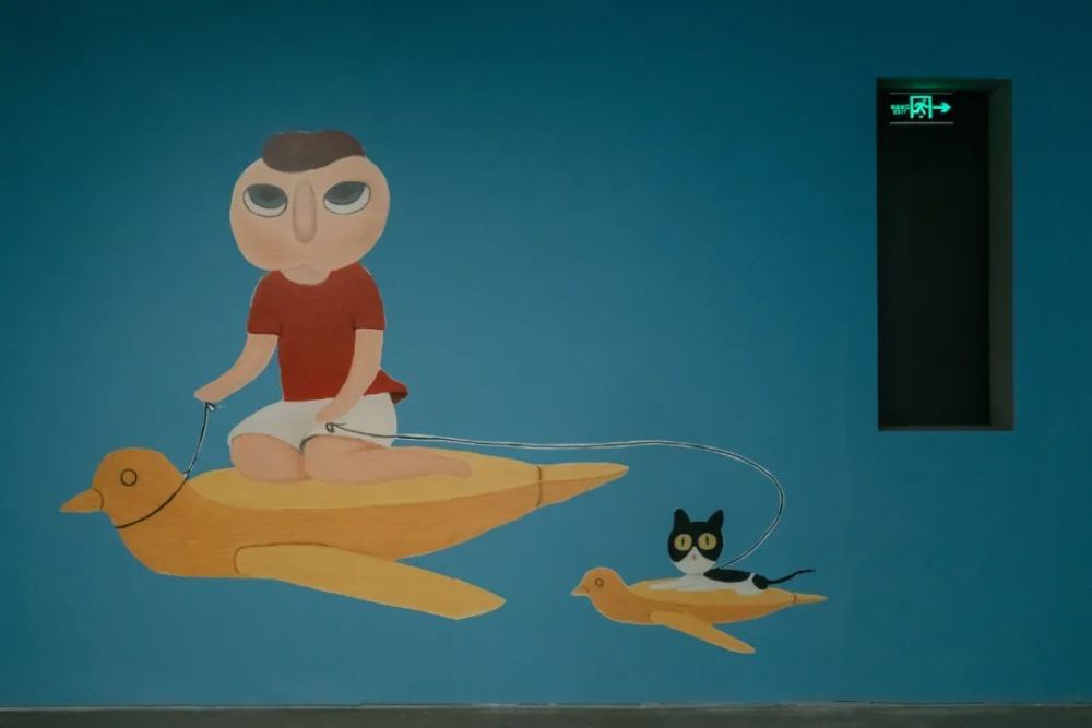 藝術家在主人公yy身旁配以小貓、小狗、小馬等靈動可愛的動物形象,在喚醒童趣之時,承載著令人玩味的寓言性。與“yy”幽藍空寂的眼神對視,不同人生閱歷的觀者都會產(chǎn)生不一樣的想法——有人看到了童年的純真,有人看到了成年后的滄桑,更有人看到了藝術家多年的禪修狀態(tài)。如果說“yy”起初誕生于藝術家本人的部分自畫像,那么“yy”在后期面向公眾時則成為了一面照見內(nèi)心的鏡子,使每一個觀眾通過凝視“yy”而直視自己。
