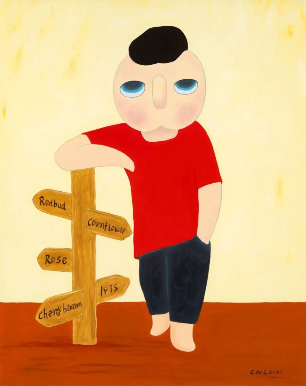 該藝術形象既映射出藝術家的自我觀照,也象征著在時代徘徊中思考著生活本質與方向的獨立個體——沒有嘴巴,卻用一種沉默的狀態(tài)去表達語言之外的意味;眼神空寂,卻又蘊藏著一種天真的平靜無畏,喚起觀者心底的共鳴與慰藉。