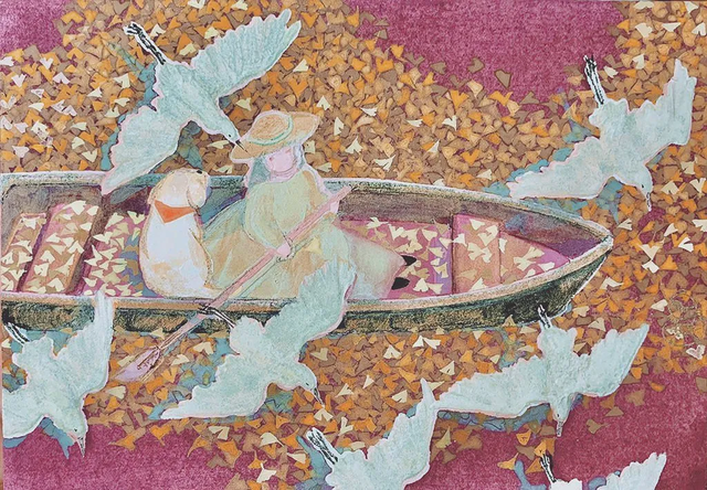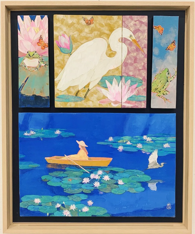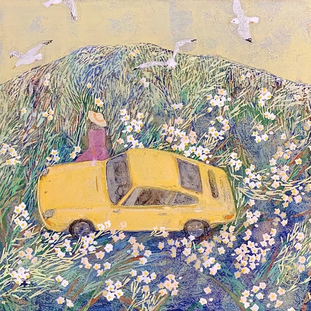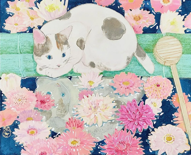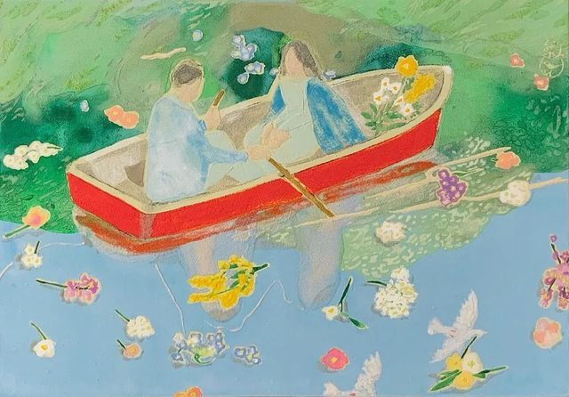 她的畫面中,出現(xiàn)次數(shù)最多的,還有許多美好的人物形象,這反映出的則是畫家對自我的內(nèi)心映照,以及對于伴侶的美好愿景。有時(shí)是一個(gè)人,一個(gè)人劃船,一個(gè)人看風(fēng)景,一個(gè)人騎著單車路過湖邊,一個(gè)人與貓和蝴蝶對話,時(shí)光靜好,無波無瀾,正是一個(gè)女孩最好的年華:有時(shí)則是兩個(gè),或與朋友、或與愛人,在櫻花倒影里劃船,在大白熊的臂彎處安眠,畫家用這些意象將人與人相處時(shí)的甜蜜溫暖盡情展現(xiàn)。
