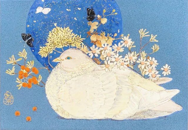 畫面的構(gòu)圖非常靈動(dòng),繁密的花叢海鷗等裝飾與精心設(shè)置的空白形成巧妙穿插,在低飽和度的灰色調(diào)中,奏出一段懶洋洋的小夜曲。