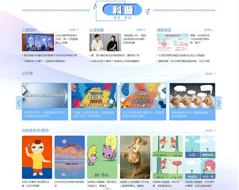 《熱點觀察》《心理訪談》從心理學(xué)視角解讀社會熱點和大眾輿情;《心理百科》《公開課》《治愈系藝術(shù)/圖書》等欄目,為大眾提供及時準(zhǔn)確的心理衛(wèi)生科普資訊和心理健康技能知識;《心理問答》《公益活動》等欄目,將針對廣大網(wǎng)友關(guān)心的心理健康問題,邀請專家進(jìn)行咨詢解答,組織公益活動邀請網(wǎng)友參與公益互助,體驗心理工作坊帶來的快樂。