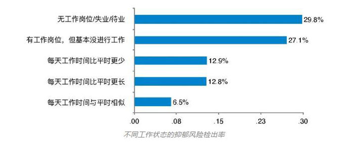 分析工作狀態(tài)與心理健康的關(guān)系,發(fā)現(xiàn):無工作崗位/失業(yè)/待業(yè)人群的抑郁風險檢出率最高,當前雖有工作崗位但基本沒進行工作的群體,抑郁風險檢出率次高,與無工作崗位/失業(yè)/待業(yè)人群非常接近。抑郁風險檢出率最低的群體是每天工作時間與平時相似的這組人群,也就是說,他們的工作狀態(tài)是較為穩(wěn)定的。相比之下,工作時間變動,無論是更少或更多的工作時間都會顯著增加抑郁的風險。