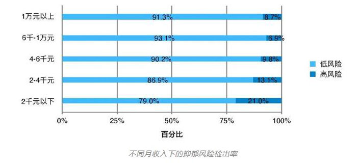 本次研究發(fā)現(xiàn),隨著月收入的增加,抑郁風險檢出率呈曲線變化。月收入2000元以下組的抑郁風險檢出率最高,顯著高于其他月收入組。