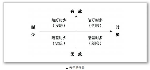 在我新出的《關(guān)鍵陪伴》一書中,有一張親子陪伴圖。橫軸代表陪伴時間長短,縱軸代表陪伴有效性,這樣就產(chǎn)生了4個象限:陪好時多(優(yōu)陪)、陪好時少(良陪)、陪差時多(差陪)和陪差時少(劣陪)。