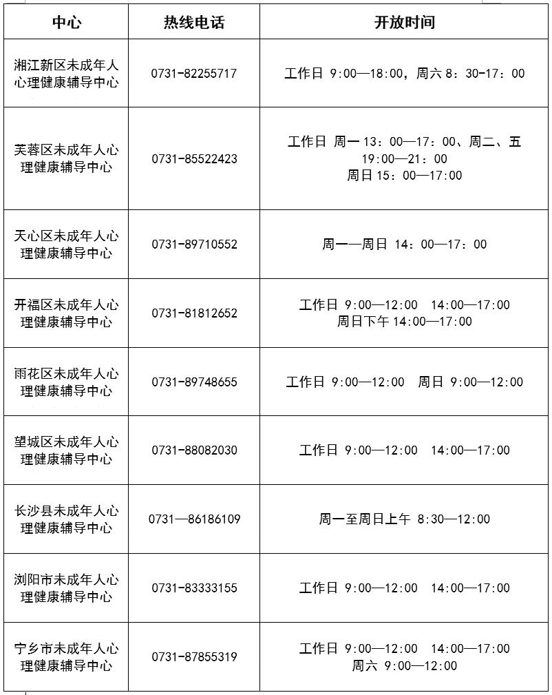 長沙市各區(qū)縣(市)未成年人心理健康輔導中心咨詢熱線及開放時間