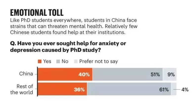 最近,在接受調(diào)查的中國博士生中,《 Nature》更新了調(diào)查數(shù)據(jù):他們中只有55%的人對自己的博士經(jīng)歷表示滿意,而40%的人由于學業(yè)而感到焦慮、抑郁而尋求幫助。