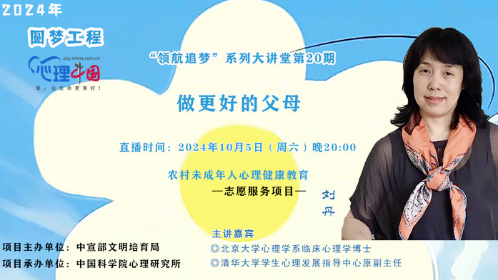 發(fā)布時(shí)間:2024-10-09 14:30:57 | 來源:中國(guó)網(wǎng)心理中國(guó) | 作者:辛理中國(guó)網(wǎng)心理中國(guó)10月5日訊 10月5日(周六)晚20:00,中國(guó)網(wǎng)心理中國(guó)聯(lián)合中科院心理研究所開啟“領(lǐng)航追夢(mèng)”系列大講堂第20期心理科普直播講座。 本期大講堂主題“做更好的父母”——攜手北京大學(xué)心理學(xué)系臨床心理學(xué)博士、曾任清華大學(xué)學(xué)生心理發(fā)展指導(dǎo)中心副主任的劉丹,共赴成長(zhǎng)之旅!解鎖親子關(guān)系的藝術(shù)密碼,深度剖析養(yǎng)育難題,劉丹以專業(yè)視角,引領(lǐng)家長(zhǎng)探索孩子的心靈世界,并成為孩子心中那束溫暖而堅(jiān)定的光。屆時(shí),中國(guó)網(wǎng)心理中國(guó)平臺(tái)將進(jìn)行直播(具體見文內(nèi)視頻直播框)。 2024年“圓夢(mèng)工程”——農(nóng)村未成年人心理健康教育志愿服務(wù)項(xiàng)目,由中宣部文明培育局委托中國(guó)科學(xué)院心理研究所國(guó)民心理健康評(píng)估發(fā)展中心負(fù)責(zé)具體實(shí)施?!邦I(lǐng)航追夢(mèng)”系列大講堂作為該項(xiàng)目的重要組成部分,將邀請(qǐng)心理、教育、醫(yī)療等相關(guān)領(lǐng)域的資深專家,連續(xù)開展20場(chǎng)左右的線上公益直播講座,為廣大農(nóng)村未成年兒童及其家長(zhǎng)和教師提供在線心理健康知識(shí)科普與問題解答。(中國(guó)網(wǎng)心理中國(guó)網(wǎng)址:http://www.sl3server.com/)