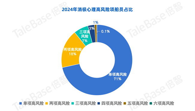 有多項(xiàng)消極心理因素同時(shí)為高風(fēng)險(xiǎn)的船員較少,6項(xiàng)消極心理因素均為“高風(fēng)險(xiǎn)”的船員占比低于1%,但同時(shí)有多項(xiàng)積極心理因素不足的船員約為40%,說(shuō)明船員整體較少存在比較極端的消極心理風(fēng)險(xiǎn),但他們?cè)诜e極心理因素的提升上有較大的發(fā)展空間,通過(guò)針對(duì)性的積極心理因素提升,補(bǔ)充心理動(dòng)能,讓他們有更多的積極心理去調(diào)節(jié)和消化消極心理,進(jìn)一步減少由于極端消極心理狀態(tài)可能導(dǎo)致的不良事件的風(fēng)險(xiǎn)。
