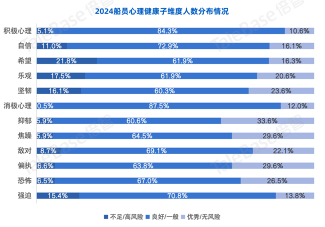 如果只關(guān)注消極心理因素,雖然從表面來(lái)看,船員的心理健康狀態(tài)可能顯示極端風(fēng)險(xiǎn)的概率較小,沒(méi)有重大問(wèn)題和較為明顯的極端事件風(fēng)險(xiǎn)。然而,積極心理因素的缺失可能導(dǎo)致嚴(yán)重后果。長(zhǎng)期缺乏希望、樂(lè)觀和堅(jiān)韌等積極心理因素,船員就無(wú)法積累足夠的心理韌性和動(dòng)能來(lái)持續(xù)面對(duì)單調(diào)和封閉的工作環(huán)境,這種缺乏可能削弱他們?cè)陂L(zhǎng)期壓力下的適應(yīng)能力,最終可能導(dǎo)致士氣低落,甚至誘發(fā)潛在的心理危機(jī)。