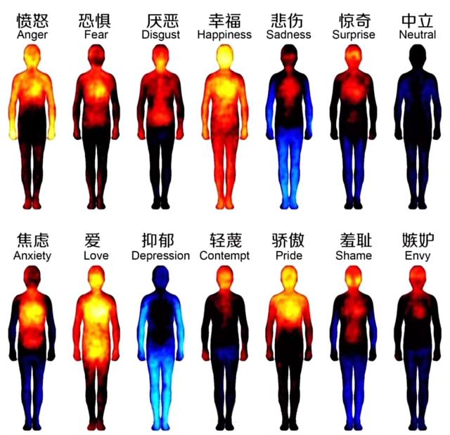 圖|《PNAS》的人體的情緒地圖:情緒高漲標(biāo)為暖色,低落標(biāo)為冷色