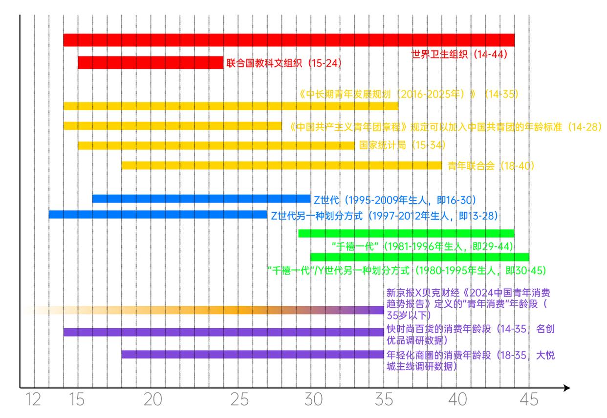 關(guān)于“青年”的定義,不同政策和機(jī)構(gòu)略有不同,總體而言分為“截止至30歲之前”和“延伸至35-45歲”兩種。后者包含了兩個(gè)在商業(yè)分析中經(jīng)常出現(xiàn),且需求有明顯差別的世代——“Z世代”和“千禧一代”各自一部分年齡段。