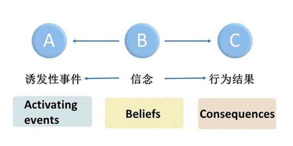 著名的理性情緒治療理論假設(shè)非理性或錯(cuò)誤的思想信念是情感障礙或異常行為產(chǎn)生的重要因素,又稱情緒ABC理論,A(Activating events)代表誘發(fā)事件(通常指逆境),B(Beliefs)代表信念,C(Consequences)代表結(jié)果。該理論的核心是:情緒不是某一誘發(fā)性事件本身所引起的,而是由經(jīng)歷了這一事件的個(gè)體對(duì)這一事件的解釋和評(píng)價(jià)所引起的。