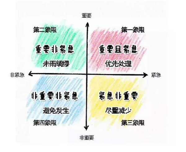 時間“四象限”法是時間管理中的重要工具。日常工作時,有計劃地完成一件事是很有必要的,但事實上,人們卻常未能及時處理,隨著時間的推移,造成工作質(zhì)量的下降。