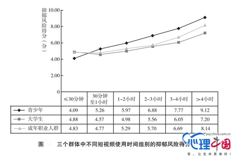 報告揭示,高強度使用短視頻與抑郁風險、焦慮風險顯著相關:青少年中隨著短視頻使用時間的增加,抑郁風險逐漸升高,而大學生和成年職業(yè)人群短視頻使用在1小時內(nèi)并沒有抑郁風險增加的狀況,適當使用(30分鐘到1小時)抑郁風險還會低一些,不過之后隨著短視頻使用時間的增加,抑郁風險也隨之增加。當短視頻使用時間超過4個小時,青少年中存在抑郁風險的比例高達 42.1%,大學生為 29.3%,成年職業(yè)人群為 34.3%。報告建議增強現(xiàn)實人際支持,發(fā)展豐富的情緒調(diào)節(jié)方式。