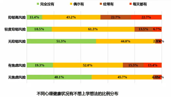 數(shù)據(jù)顯示,在無(wú)抑郁風(fēng)險(xiǎn)的青少年中,經(jīng)?;蛎刻觳幌肷蠈W(xué)的不到5%。存在抑郁高風(fēng)險(xiǎn)的青少年中,超過(guò)四成“經(jīng)?!被颉懊刻臁庇小安幌肷蠈W(xué)”的想法。