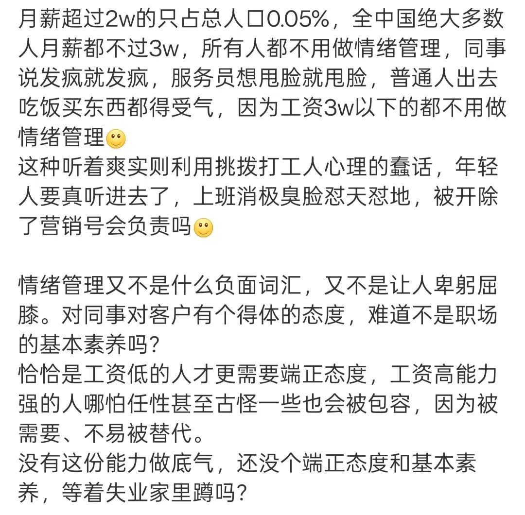 還有網(wǎng)友理智地分析,無論月薪3千還是3萬,都需要情緒管理,這是一種素質(zhì)。
