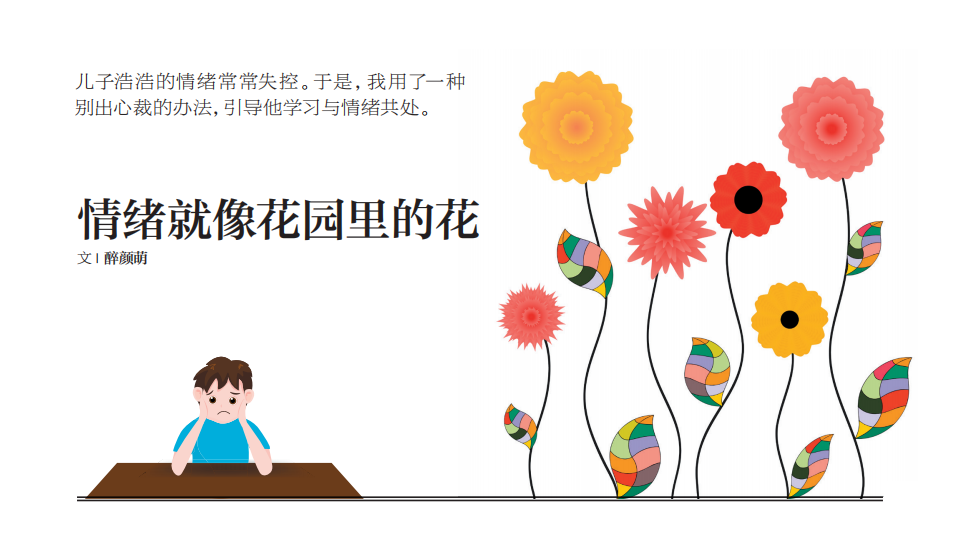 浩浩到了10歲時(shí),除了偶爾特別激動(dòng),他已經(jīng)基本能控制自己的情緒了。有一天,他從書架上翻出我之前圈畫過的繪本,疑惑地問我:“媽媽,情緒花園里是不是除了向日葵,還該有別的花?”我愣了一下,好奇地問:“為什么這么說呢?”